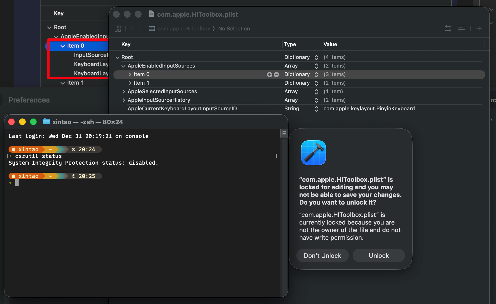 错误处理:“com.apple.HIToolbox.plist” is currently locked because you are not the owner of the file and do not have write permission. 解决办法:提权