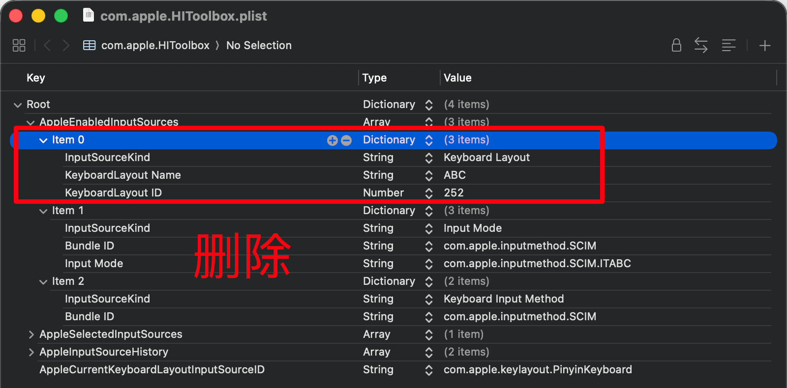 ~/Library/Preferences/com.apple.HIToolbox.plist这个文件,删除ABC这个item,保存退出生效。错误处理:“com.apple.HIToolbox.plist” is currently locked because you are not the owner of the file and do not have write permission. 解决办法:提权